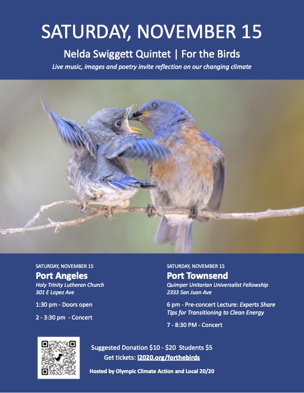 Saturday, November 15. For the Birds: live music, images and poetry invite reflection on our changing climate. Featuring Nelda Swiggett (piano/compositions), Sidney Hauser (saxes), Clif Swiggett (trombone), Chris Symer (bass), Adam Kessler (drums) and the poetry of Jill McGrath. Hosted by Olympic Climate Action and Local 20/20.
