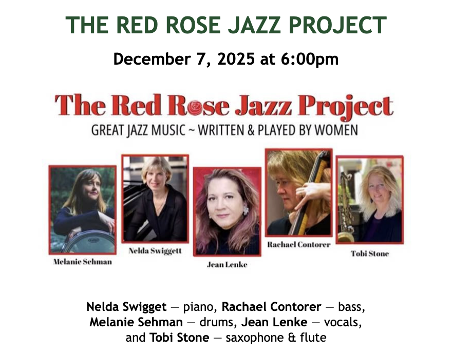 Sunday, December 7. Seattle Jazz Vespers concert series. 6 – 8 pm. Jean Lenke Rose Band. Free. Seattle First Baptist Church. 1111 Harvard Ave, Seattle, WA 98122. Goodwill offering requested.